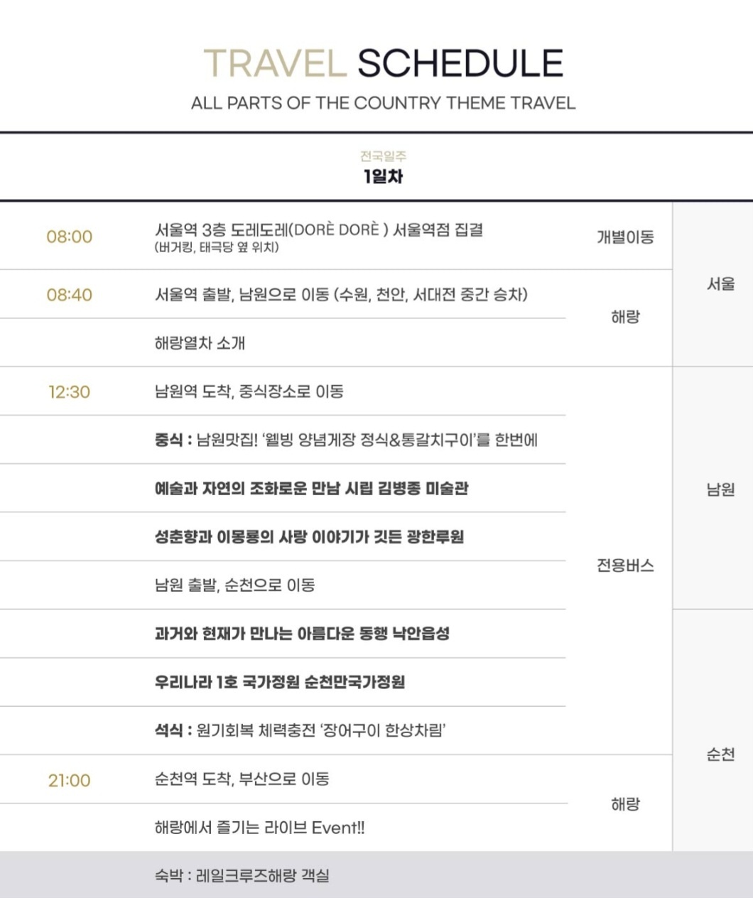 해랑 열차는 국내 유일의 숙박형 관광 열차로, 서울역을 출발해 전국을 한 바퀴 도는 일정으로 운영됩니다.